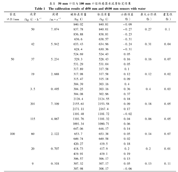 為了評測系統的實際應用效果,進行了水流量標定實驗。分別針對50mm口徑與100mm口徑的傳感器進行標定。系統勵磁方式采用方波勵磁,勵磁頻率為12.5Hz,管道*大流速為7m/s左右,*小流速為0.3 m/s左右,標定結果如表1所示。