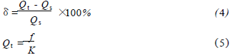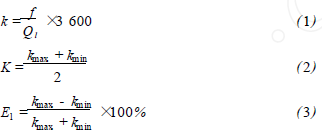 過熱蒸汽流量計在標準水裝置上,分別用頻譜分析和脈沖計數的方法進行標定,流體介質為水未加氣體,采用的標準傳感器為精度等級為0.2級的電磁流量計。在每個流量測量點上的儀表系數用公式(1)計算,然后用式(2)計算得到*終儀表系數K。Ql為被測水的流量值,f為每一個流量點得到的頻率,k為每個測量點得到的儀表系數。kmax、kmin分別為試驗流量范圍內得到的*大與*小的儀表系數。儀表系數的線性度E1用式(3)來計算。