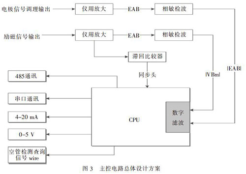 電極檢測出的微弱感應(yīng)電動勢E, 先經(jīng)前置放大器的放大和噪聲抑制而成為大幅度低阻抗的電壓信號。此信號經(jīng)相敏檢波后,給CPU 進行數(shù)字濾波、處理和控制,通過利用雙線性變換法將模擬的二階巴特沃斯低通濾波器轉(zhuǎn)換為數(shù)字式濾波器,既簡化電路設(shè)計,且可靠性高、穩(wěn)定性好。通過編寫軟件CPU 能對放大器的溫度漂移及零點漂移給予補償, 并在測量的全量程范圍內(nèi)分10 段對信號進行非線性修正,使得測量值更好地擬合真實數(shù)據(jù)。空管檢測電路上,CPU 作為從控制器。當(dāng)主控制電路上發(fā)出空管檢測查詢信號wire, 從控制器進行識別后接收并判斷出查詢什么信號,然后產(chǎn)生應(yīng)答信號上傳至主控芯片輸出顯示;當(dāng)檢測為空管信號時, 從CPU 發(fā)出的zero 信號通過控制MOS 管開關(guān)來關(guān)斷流速輸出。在應(yīng)用中,對于微弱信號的放大及提取還需注意PCB 板設(shè)計時EMI 電磁屏蔽考慮,屏蔽來自空間磁場的干擾、周邊設(shè)備的輻射造成的干擾和板內(nèi)之間的干擾,如數(shù)模分離、強弱電分離等等。