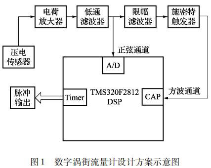 本文設計的基于 TMS320F2812 DSP 的數字二氧化碳流量計的信號處理系統由前置放大電路和數字信號處理電路兩部分組成。本文選用的前置放大電路即為目前被廣泛應用的普通二氧化碳流量計的前置放大電路,主要由電荷放大電路、低通濾波電路、限幅濾波電路和施密特觸發電路組成; 對于經壓電傳感器測得的渦街信號采用了頻域分析和時域分析相結合的方式,即由前置放大電路和數字信號處理電路相配合。時域分析通道利用 DSP 事件管理器的捕獲模塊,對前置放大電路輸出的方波進行頻率計算,然后再由 DSP 事件管理器通用定時器的比較輸出模塊進行脈沖輸出。頻域分析通道即 DSP對低通濾波電路輸出的疊加了許多噪聲的正弦信號進行 A/D 采樣,再利用 DSP 對 A/D 采樣的結果進行頻譜分析,從而得出此時渦街信號的頻率,*后由 DSP 通用定時器的比較輸出模塊進行脈沖輸出。系統設計方案示意圖如圖 1 所示。