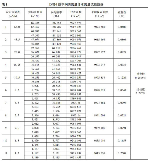 將本文實現的數字二氧化碳流量計在上述 50mm 口 徑( 簡稱 DN50) 的水流量試驗裝置上進行試驗。先在其正常流量范圍內進行試驗,流量從大到小逐漸降低,之后不斷探求其所能測量的*小流量。每個流量點試驗三次,計算其重復性、平均儀表系數和線性度。水流量試驗數據如表 1 所示。