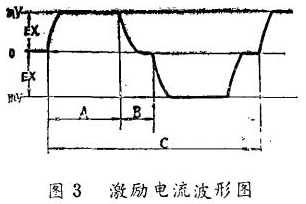 (1)激勵電流的波形檢查。在激勵電流檢查端EX+和EX一之間連接一個電阻(IΩ士0.1%),這個電阻與激勵線圈串聯,示波器輸入端并聯在電阻上。若波形起伏很大時,則不正常。波形正,負方向對稱,A一C測量周期值在規定的范圍內則為正常,其波形如圖3所示。
