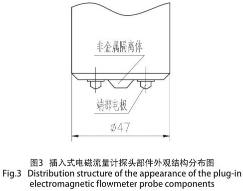 通過大量的試驗,對探頭端部外型結構亦采用特殊設計,從而消除兩個電極之間的擾流現(xiàn)象,同時亦消除因通電產生磁場,導致兩個電極吸附介質中的鐵屑而影響測量精度和死區(qū)效應,增強了輸出信號的穩(wěn)定性,從而提高傳感器準確度和抗干擾性。通過結構的優(yōu)化設計,使用壽命更長,電磁流量計探頭局部,如圖 3 所示。