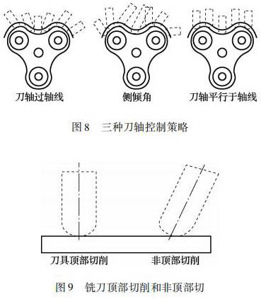 四軸加工中采用球頭銑刀,刀軸控制策略是提高加工效率和轉(zhuǎn)子曲面表面粗糙度的關(guān)鍵。如圖 8所示,刀軸控制策略有常見(jiàn)的刀軸過(guò)軸線(xiàn)、側(cè)傾角、刀軸平行于軸線(xiàn)。筆者采用平行軸線(xiàn)銑削加工方式對(duì)這 3 種刀軸控制策略進(jìn)行實(shí)際加工對(duì)比,得出采用側(cè)傾角刀軸控制策略加工出的轉(zhuǎn)子曲面表面粗糙度*好。其原因主要由于刀軸平行于軸線(xiàn)這種刀軸控制策略采用球頭銑刀加工時(shí),其刀具切削轉(zhuǎn)子曲面時(shí)的接觸點(diǎn)為刀具的頂部,球頭銑刀的頂部直徑為零,線(xiàn)速度也為零。此時(shí)刀具是在擠壓工件,刀具頂部也容易磨損。刀軸過(guò)軸線(xiàn)策略雖然刀具與轉(zhuǎn)子曲面的接觸點(diǎn)一直在變換,但是也有刀位點(diǎn)是采用刀具頂部去切削。側(cè)前傾角刀軸控制策略: 控制刀具與轉(zhuǎn)子曲面接觸點(diǎn)的位置,避免球頭銑刀頂部銑削轉(zhuǎn)子曲面,實(shí)現(xiàn)刀尖的點(diǎn)的偏離,提高刀具切削點(diǎn)的線(xiàn)速度。球頭銑刀頂部切削和非頂部切削如圖 9 所示。