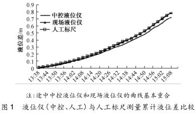 液位的測量是整個容積法校驗的重點,其準確度直接關乎計量結果。由于液位儀信號非數字傳輸,在測量過程中安裝了人工標尺這一液位簡易測量裝置,供校核液位儀使用。將測量的累計液位差同液位儀(中控、現場)測得數據進行比較,如圖 1 所示。