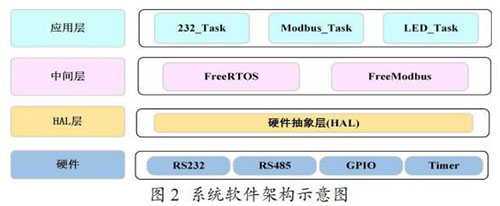 Modbus 通訊模塊的軟件架構(gòu)如圖 2 所示,分為硬件層、硬件抽象層,中間層和應(yīng)用層。中間層包括一個(gè)實(shí)時(shí)操作系統(tǒng)FreeRTOS 和一個(gè)針對(duì)嵌入式環(huán)境開發(fā)的輕量級(jí) Modbus 協(xié)議庫Freemodbus。在應(yīng)用層,主要?jiǎng)?chuàng)建了三個(gè)任務(wù),232_Task 負(fù)責(zé)讀 取和解析流量計(jì)表頭輸出的文本信息,Modbus_Task 負(fù)責(zé)存儲(chǔ) 解析后的流量計(jì)數(shù)據(jù)到 Modbus 寄存器表,以及以 Modbus 協(xié)議與取水監(jiān)測(cè)設(shè)備通信,LED_Task 是一個(gè)輔助任務(wù),主要用來提示程序運(yùn)行狀態(tài)。
