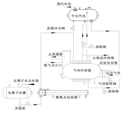 來(lái)自無(wú)離子水罐的脫氧水經(jīng)多經(jīng)泵加壓、經(jīng)脫氧水加熱器加熱后進(jìn)入到智能型渦街流量計(jì)的水段,脫氧水與反應(yīng)氣體換熱后分兩路:一路進(jìn)入中壓汽包,保證汽包有穩(wěn)定的液位;一路進(jìn)入熔鹽冷卻器帶出熔鹽攜帶的反應(yīng)熱。來(lái)自中壓汽包的高溫水經(jīng)管路接至智能型渦街流量計(jì)汽段底部,高溫水與反應(yīng)氣體換熱后產(chǎn)生高壓蒸汽,高壓蒸汽又返回中壓汽包。汽包還有一路直接注水管路,此路水不經(jīng)過(guò)智能型渦街流量計(jì)水段,而是直接進(jìn)入汽包。在智能型渦街流量計(jì)出口溫度偏低而汽包液位也比較低時(shí),可開(kāi)此直接注水管路來(lái)穩(wěn)定汽包液位。其詳細(xì)流程圖如圖 2。