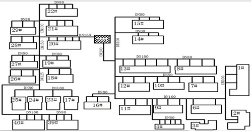 某小區(qū)住宅樓建設(shè)于1996年,建筑結(jié)構(gòu)為磚混建筑,建筑面積為54931m2,共30棟住宅樓。2017年繳費739戶,總采暖面積為47141m2。換熱站位于小區(qū)中部,板式換熱機(jī)組設(shè)計換熱面積為50000m2,循環(huán)泵額定功率為30kW,流量為200m³/h,揚程為32m。庭院管網(wǎng)共分為2個支狀供回水環(huán)路,該小區(qū)供熱管網(wǎng)見圖1所示。