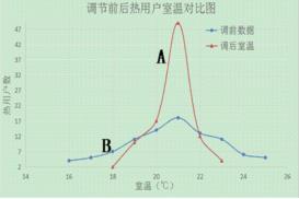 圖3中的曲線 A和B供熱管網(wǎng)渦街流量計調(diào)節(jié)前后的熱用戶室溫變化情況,橫坐標(biāo)表示室溫分布,縱坐標(biāo)表示熱用戶數(shù)量。從圖中可以看出,渦街流量計調(diào)節(jié)前熱用戶室溫比較分散,既有室溫小于18℃的熱用戶,也有室溫大于24℃的熱用戶。熱用戶室溫“近熱遠(yuǎn)冷”,供熱管網(wǎng)存在水力不平衡現(xiàn)象。渦街流量計調(diào)節(jié)后,有49戶用戶室溫在20℃~21℃之間,從圖中可以看出室溫分布范圍縮小,平均室溫降低,從而,不僅減少了供熱量,也大大提高了供熱品質(zhì)。一般來講,對采暖系統(tǒng),每增加 1℃平均室溫,能耗增多 5%~10%。采暖系統(tǒng)實現(xiàn)平衡后,常常可以降低平均室溫1℃~3℃。