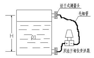 法蘭式液位變送器的測量原理與差壓式液位變送器基本相同,遷移量和量程也可以通過上述的公式計算得出,在此不再列出。計算遷移量時不需考慮差壓變送器的安裝位置,只要考慮法蘭式液位變送器毛細管內所充硅油的密度和兩個法蘭中心高度差,見圖7示意圖。
