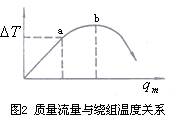 在總的熱傳導系數a中,因測量管壁很薄且具有相對較高熱導率,儀表制成后其值不變,因此a的變化可簡化認為主要是流體邊界層熱導率的變化。當使用于某一特定范圍的流體時,則a、cp均視為常量,則質量流量僅與繞組平均溫度差成正比,如圖2 oa 段所示。 oa段為儀表正常測量范圍,儀表出口處流體不帶走熱量,或者說帶走熱量極微;超過a點流量增大到有部分熱量被帶走而呈現非線性,流量超過b點則大量熱量被帶走。