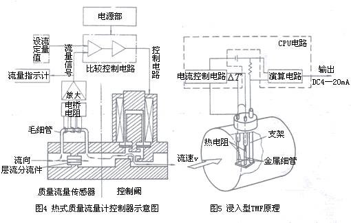 市場上熱分布式tmf按測量管內徑分為細管型(也有稱毛細管型)和小型兩大類,結構上有較大區別。小型測量管儀表只有直管型,內徑為4mm;細管型測量管內徑僅0.2~0.5mm。稍大者為0.8~1mm,極容易堵塞,只適用于凈化無塵氣體。細管型儀表還有一種帶有調節單元和控制閥等組成一體的熱式質量流量控制器,結構如圖4所示。