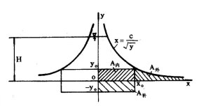 根據雙曲線薄壁堰口尺寸變化關系為即縱坐標y值趨近于零時,橫坐標x值趨近無窮大。這在堰板的實際制作上是無法實現的。若將堰口曲線的*低縱坐標取為yo,在yo一下至(-yo)增開一矩形,即高為2yo,寬為2x。的補償孔,從數學上可以證明,坐標原點以下所增大的矩形面積(A補)正好等于舍去的曲邊面積(A補)。由圖3可知