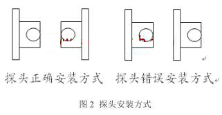 d.探頭安裝時要注意方向。該廠流量計一度頻頻歸零,起先找了很多原因,如給流量計井做防水,更換耦合劑等,但是效果并沒有大的改善。結果是雖然頻頻更換耦合劑,但二次表中信號強度*好僅能達到44dB,且信號強度不穩定,浮動較大,導致流量不夠準確。有時甚至涂抹一次耦合劑只能正常顯示數據一天時間。后來發現一個探頭在兩根鋼帶內側,另一個探頭在兩根鋼帶外側,而兩個探頭應該同在兩根鋼帶內側,如圖2所示。錯誤安裝方式的結果是聲波信號接收效果不好。將安裝方式更改之后,信號強度*好能達到70dB,并穩定在60-70dB之間,從而保證了流量數據的準確性。