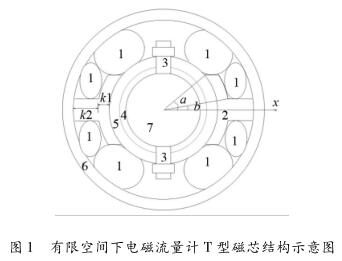 T型磁芯是為較小的空間下實(shí)現(xiàn)盡可能大的勵(lì)磁線圈而提出的,如圖1所示為較小空間結(jié)構(gòu)下,設(shè)計(jì)有T型磁芯的井水流量計(jì)傳感器截面圖。在圖中1表示線圈位置;2表示磁芯位置;3表示電極及其固定器件位置;4表示襯里位置;5表示內(nèi)徑壁位置;6表示外徑壁;7表示測(cè)量管道(測(cè)量區(qū)域)。如圖1所示井水流量計(jì)勵(lì)磁結(jié)構(gòu)磁芯造型近似為T型(因稱為T型磁芯),磁芯在靠近井水流量計(jì)內(nèi)管道時(shí)為T型磁芯的較長端。如圖中所示,T型磁芯較長端與x軸夾角為a,T型磁芯較短端與x軸夾角為b,T型磁芯較長端寬度為k1,T型磁芯較短端寬度為k2。
