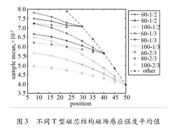 如圖3所示為不同T型磁芯結(jié)構(gòu)下測(cè)量區(qū)域產(chǎn)生磁場(chǎng)感應(yīng)強(qiáng)度平均值,圖中橫坐標(biāo)為T型磁芯b的角度,縱坐標(biāo)為測(cè)量區(qū)域的平均磁場(chǎng)強(qiáng)度,圖標(biāo)表示的是T型磁芯的不同a的角度以及磁芯長端寬度所占的比例。其中以“角度-比例”表示,例如30-1/2表示T型磁芯的較長端角度a為30°,k1/(k1+k2)為1/2時(shí)的測(cè)量區(qū)域中平均磁場(chǎng)強(qiáng)度測(cè)量結(jié)果。圖標(biāo)Other為T型磁芯較長端的角度a與較短端的角度b相等(即為23,30,35,40,45,50)時(shí)的流量計(jì)測(cè)量區(qū)域中的平均磁場(chǎng)強(qiáng)度。從仿真結(jié)果可以看出:T型磁芯的較長端的角度a越小,流量計(jì)測(cè)量區(qū)域中平均磁場(chǎng)強(qiáng)度越大;在T型磁芯的較長端的角度a一定時(shí),T型磁芯的較短端的角度b越小,流量計(jì)測(cè)量區(qū)域中平均磁場(chǎng)強(qiáng)度越大;在T型磁芯的較長端的角度a與較短端的角度b一定時(shí),T型磁芯的k1/(k1 + k2)越小,在流量計(jì)測(cè)量區(qū)域中平均磁場(chǎng)強(qiáng)度越大。