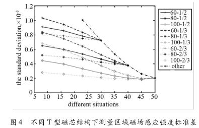 如圖4所示為不同T型磁芯結(jié)構(gòu)下測(cè)量區(qū)域產(chǎn)生磁場(chǎng)感應(yīng)強(qiáng)度標(biāo)準(zhǔn)差,圖中橫坐標(biāo)為T型磁芯b的角度,縱坐標(biāo)為測(cè)量區(qū)域磁場(chǎng)強(qiáng)度的標(biāo)準(zhǔn)差,圖標(biāo)圖例與圖3中一致。從仿真結(jié)果可以看出:T型磁芯的較長端的角度a越小,流量計(jì)測(cè)量區(qū)域中磁場(chǎng)強(qiáng)度標(biāo)準(zhǔn)差越大;在T型磁芯的較長端的角度a一定時(shí),T型磁芯的較短端的角度b越小,流量計(jì)測(cè)量區(qū)域中磁場(chǎng)強(qiáng)度標(biāo)準(zhǔn)差越大;在T型磁芯的較長端的角度a與較短端的角度b一定時(shí),T型磁芯的k1/(k1 + k2)越小,在流量計(jì)測(cè)量區(qū)域中磁場(chǎng)強(qiáng)度標(biāo)準(zhǔn)差越大。