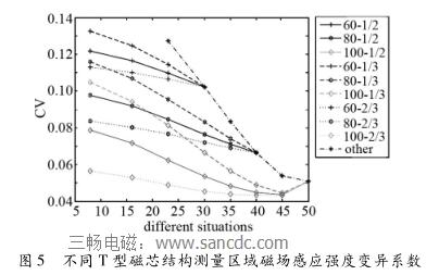 標(biāo)準(zhǔn)差代表磁場(chǎng)測(cè)量區(qū)域的磁場(chǎng)分布波動(dòng)性較大,因而需引入變異系數(shù)對(duì)測(cè)量區(qū)域中的磁場(chǎng)分布情況進(jìn)一步分析。如圖5所示為不同T型磁芯結(jié)構(gòu)下測(cè)量區(qū)域磁場(chǎng)感應(yīng)強(qiáng)度變異系數(shù),圖中橫坐標(biāo)為T型磁芯b的角度,縱坐標(biāo)為測(cè)量區(qū)域磁場(chǎng)強(qiáng)度分布的變異系數(shù),圖標(biāo)圖例與圖3中一致。從仿真結(jié)果可以看出:T型磁芯的較長端的角度a越小,流量計(jì)測(cè)量區(qū)域中磁場(chǎng)強(qiáng)度變異系數(shù)越大;在T型磁芯的較長端的角度a一定時(shí),T型磁芯的較短端的角度b越小,流量計(jì)測(cè)量區(qū)域中磁場(chǎng)強(qiáng)度變異系數(shù)越大;在T型磁芯的較長端的角度a與較短端的角度b一定時(shí),T型磁芯的k1/(k1 + k2)越小,在流量計(jì)測(cè)量區(qū)域中磁場(chǎng)強(qiáng)度變異系數(shù)越大。異系數(shù)越大說明磁場(chǎng)分布越不均勻,波動(dòng)性越大;異系數(shù)越小說明磁場(chǎng)分布趨向均勻。下面通過計(jì)算測(cè)量區(qū)域中的磁場(chǎng)均勻區(qū)域來對(duì)這一結(jié)果進(jìn)一步的分析。