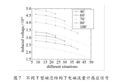 從仿真結(jié)果可以看出:T型磁芯的較長端的角度a越小,流量計(jì)電極兩端獲得的感應(yīng)信號(hào)越大;在T型磁芯的較長端的角度a一定時(shí),T型磁芯的較短端的角度b越小,流量計(jì)電極兩端獲得的感應(yīng)信號(hào)越大。這主要是因?yàn)?strong>井水流量計(jì)勵(lì)磁線圈的增加,使得流量計(jì)測(cè)量區(qū)域的磁場(chǎng)強(qiáng)度增加,同樣分布的流速下使得流量計(jì)電極兩端的感應(yīng)信號(hào)增加。